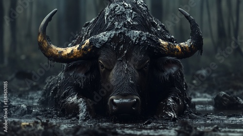 © W saputro, Naklejka premium Mud-covered bull resting in swampy forest