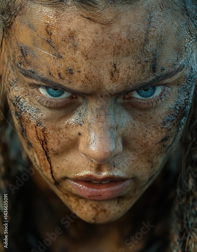 © prem, Fototapeta premium Mud-Covered Warrior Intense Stare Strength Determination