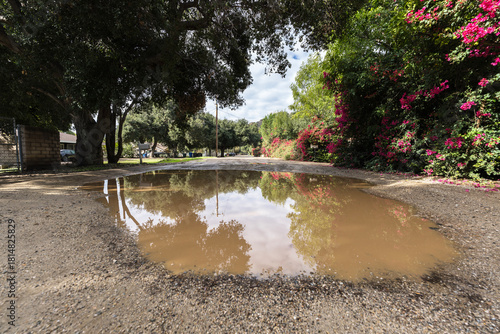 Obraz premium Mud puddle on rural dirt road in suburban Chatsworth California.