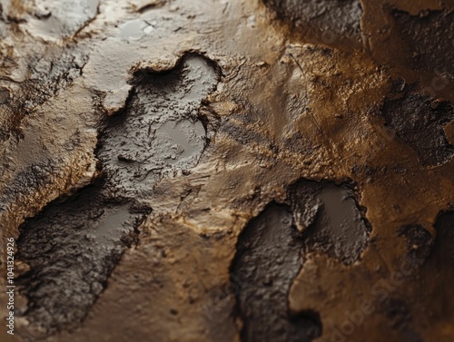 © Manyapha, Obraz premium Mud texture marked by footprints, stratified soil, and a damp surface shimmering under subdued light.