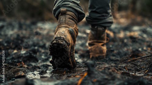 © RISHAD, Obraz premium Muddy boots treading through a wet trail.