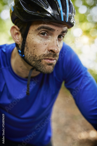 © sanneberg, Fototapeta premium Muddy cycle man looking away, close up