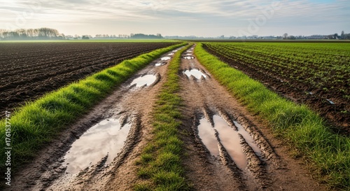 © Imagera, Fototapeta premium Muddy dirt road with puddles winding through cultivated fields