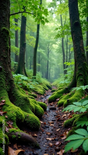 © Kachaphot, Fototapeta premium Muddy forest floor with moss-covered tree trunks and ferns, nature, grunge, forest