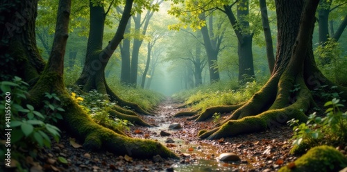 © Kachaphot, Naklejka premium Muddy forest landscape with gnarled tree trunks and overgrown vegetation, foliage, earthy