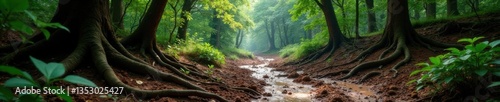 © Phennapha, Obraz premium Muddy forest landscape with twisted tree roots and overgrown vegetation, rugged, decayed