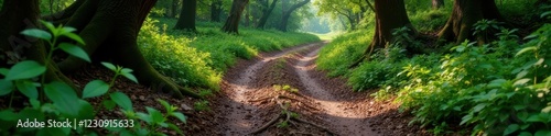 © dadtophoto, Fototapeta premium Muddy forest path with overgrown vegetation and twisted tree roots , decay, damp