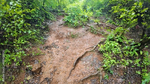 © sumit, Fototapeta premium Muddy forest path with rain falling