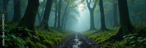 Naklejka premium Muddy forest with overgrown trees and misty atmosphere, mist, nature