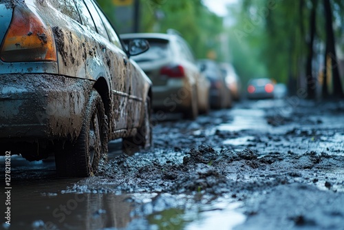 © EpicFade, Fototapeta premium Muddy Mayhem Cars Caked in Earthy Grime After a Downpour on a Roadside Scene with a Moody Tone and a Low Angle Shot