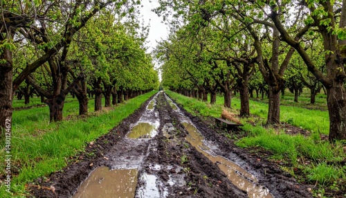 © Kitta Studio, Fototapeta premium Muddy Path Through Lush Green Orchard Under Cloudy Sky