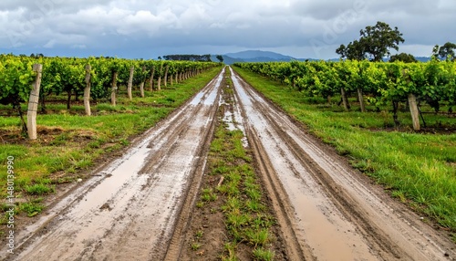 Fototapeta premium Muddy Road Through Lush Vineyard After Rainy Weather in Scenic Hills