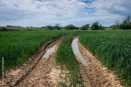 © Rob Wilkinson, Fototapeta premium Muddy tyre tracks in a field.