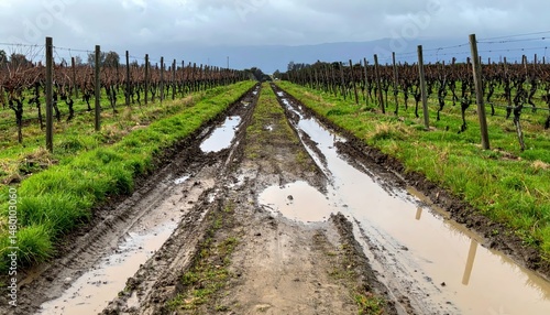 © Kitta Studio, Obraz premium Muddy Vineyard Pathway Between Rows of Grapevines on a Cloudy Day