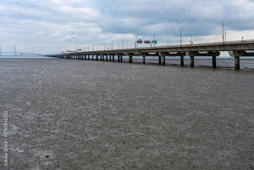 Fototapeta premium mudflat beach and long bridge on a cloudy day
