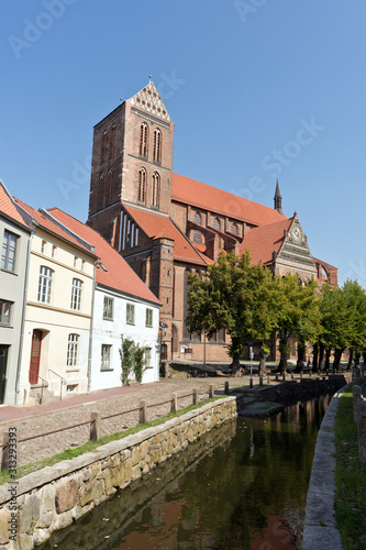 Naklejka premium Muehlengrube River with St. Nicholas Church, Wismar, Mecklenburg-Western Pomerania, Germany