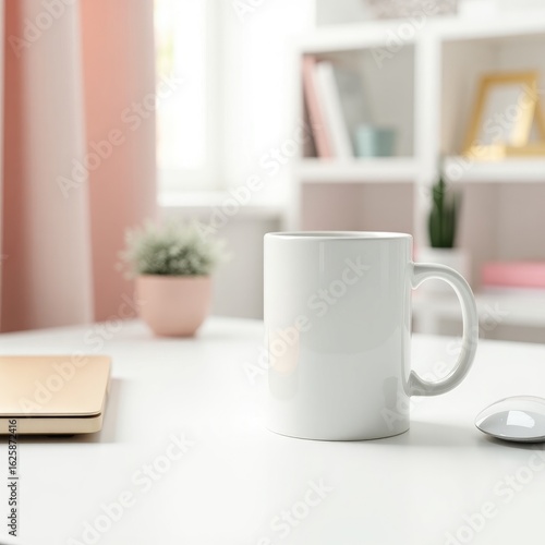 © Reazy Studio, Obraz premium Mug mockup a white mug on a desk with a laptop and mouse near a window and a bookshelf in the background