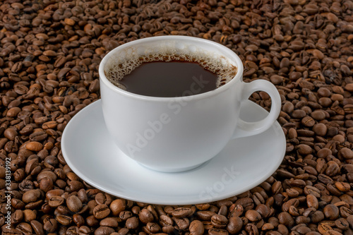 © Serhii, Fototapeta premium Mug of coffee, white in fried beans