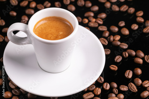 Fototapeta premium Mugful of coffee in white cup and saucer with coffee grains background