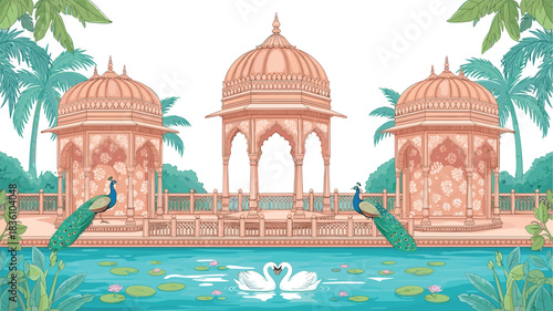 Naklejka premium Mughal Architecture Gazebo Garden, Indian Palace Pavilion, Romantic Swans on Water, Peacocks, Palm Trees, Traditional Rajasthani Style, Detailed Vector Illustration, Wedding.
