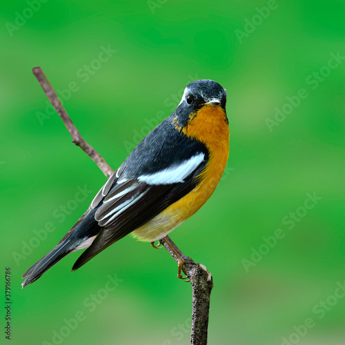 © prin79, Fototapeta premium Mugimaki Flycatcher with nice details on its feathers, Ficedula mugimaki, isolated green background, bird