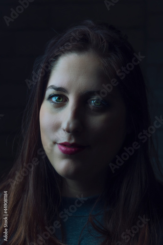 Fototapeta premium mujer con ojos verdes y labios rojos posando con luz lateral, retrato con luz lateral, rostro femenino con la mitad de la cara iluminada y la otra mitad con sombra