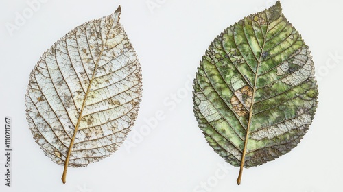 © ArtificialHorizons, Obraz premium Mulberry green and dried leaf on a white background showcasing distinct textures in an herbarium collection concept