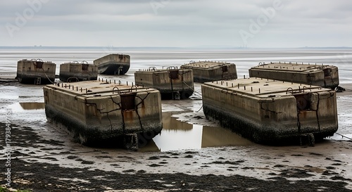 © Sapi, Fototapeta premium Mulberry Harbour Remains - Concrete Caissons on Arromanches Beach, Normandy.