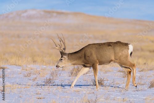 © Gary, Naklejka premium Mule deer buck. Colorado Wildlife. Wild Deer on the High Plains of Colorado. Mule deer buck in a snow covered field.
