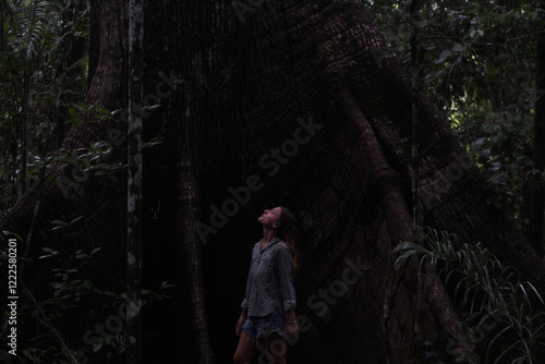 © carina furlanetto, Obraz premium mulher ao lado de sumaúma no parque nacional do viruá, roraima