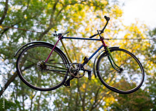 © Serhii, Fototapeta premium Multi-colored bicycle hanging in the air among the trees in the park