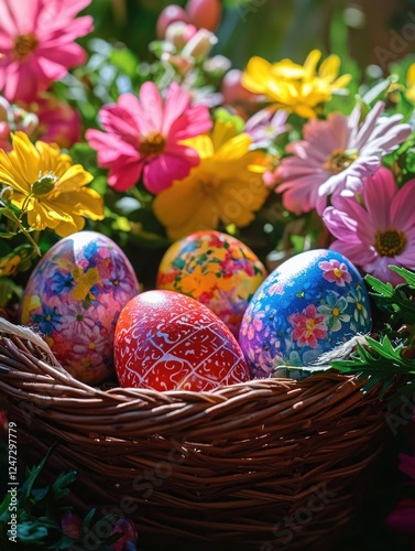Fototapeta premium Multi-colored eggs in a basket with flowers around them.