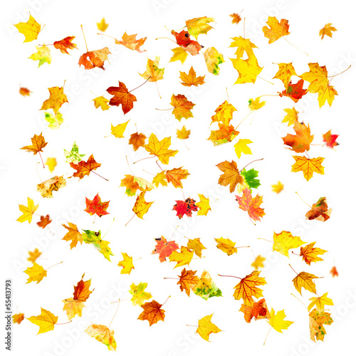 © Oleksandr Dibrova, Naklejka premium Multi colored falling autumn maple leaves isolated on white
