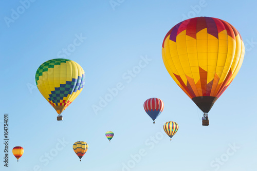 © Mariusz Blach, Naklejka premium Multi colored hot air balloons in bright morning sky, group of balloons in sunny blue sky photographed from side