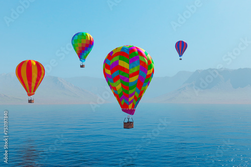 © Dabarti, Fototapeta premium Multi-colored hot air balloons over the lake surrounded by mountains. Blue sky.