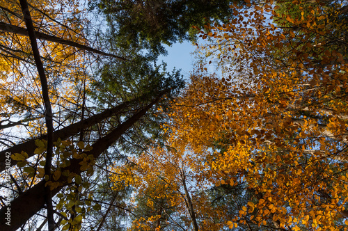 © Gabriel Teleptean, Fototapeta premium Multi colored trees and autumn sun shining in the blue sky. Golden autumn scene in a forest, with falling leaves, the sun shining through the trees and blue sky