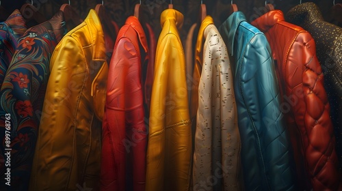 © Sor Ser, Fototapeta premium Multi-colored women's jackets hanging on hangers, background, wallpaper, graphic resource