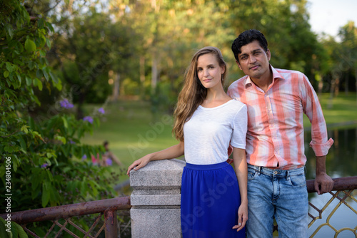 © Ranta Images, Fototapeta premium Multi ethnic couple standing together on the bridge of peaceful