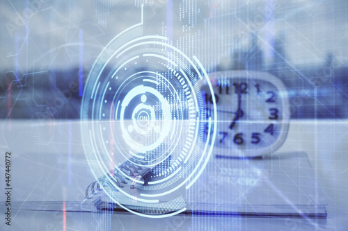 Obraz premium Multi exposure of data theme drawings and desk with open notebook background....