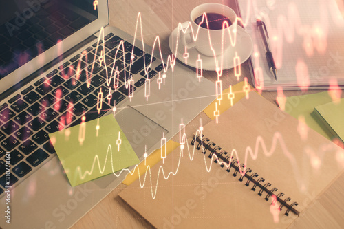 Naklejka premium Multi exposure of forex graph drawing and desktop with coffee and items on...