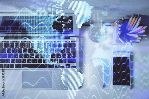 © peshkova, Obraz premium Multi exposure of forex graph drawing over desktop background with computer. Concept of financial analysis. Top view.