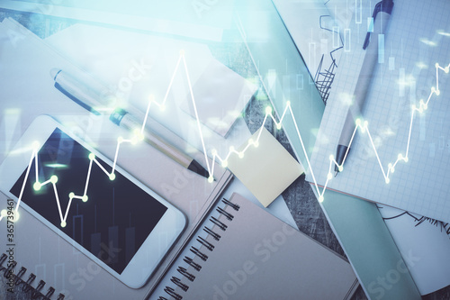 Fototapeta premium Multi exposure of forex graph hologram over desktop with phone. Top view....