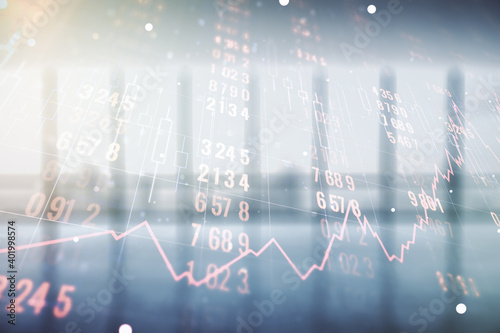 Obraz premium Multi exposure of stats data illustration on empty corporate office background, computing and analytics concept