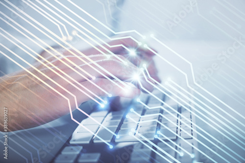 Naklejka premium Multi exposure of tech drawings with man working on computer background. Concept of innovation.