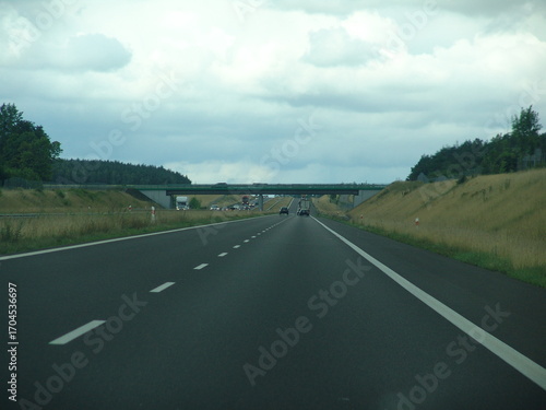 © Martins, Fototapeta premium Multi-lane highway under cloudy skies with cars in motion, grassy median, and forested surroundings—modern road infrastructure in a natural setting.