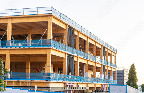 Obraz premium Multi-level wooden and steel framed building under construction with blue...
