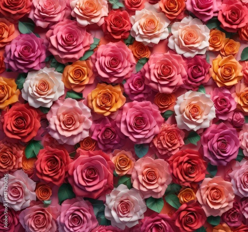 © Nutwarun, Obraz premium Multi-sized paper roses, colorful gradient, floral wall, colorful rose wall, flower