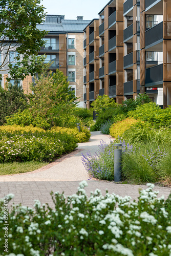Naklejka premium Multi story buildings with wooden accents and large windows surround a pathway through a garden with vibrant plants, flowers, trees, and shrubs.