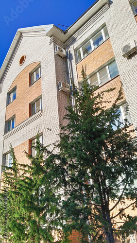 © NVS my world, Fototapeta premium Multi-story residential building. Sale rental apartments. Housing development. City life. Real estate. Mortgage concept. Condos. Interest Rate. Flat. Green tree. Air conditioner on brick wall.