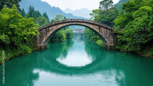 © Creator88, Fototapeta premium Multiarched brick bridge over a tranquil river, reflecting the rural village architecture nearby